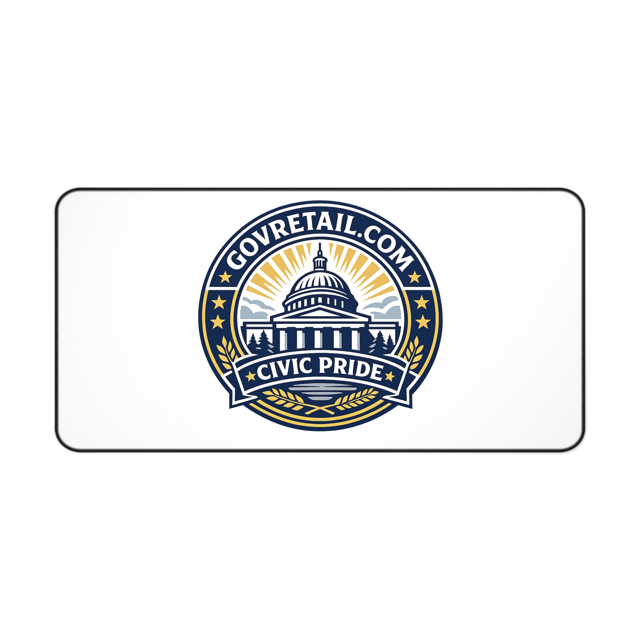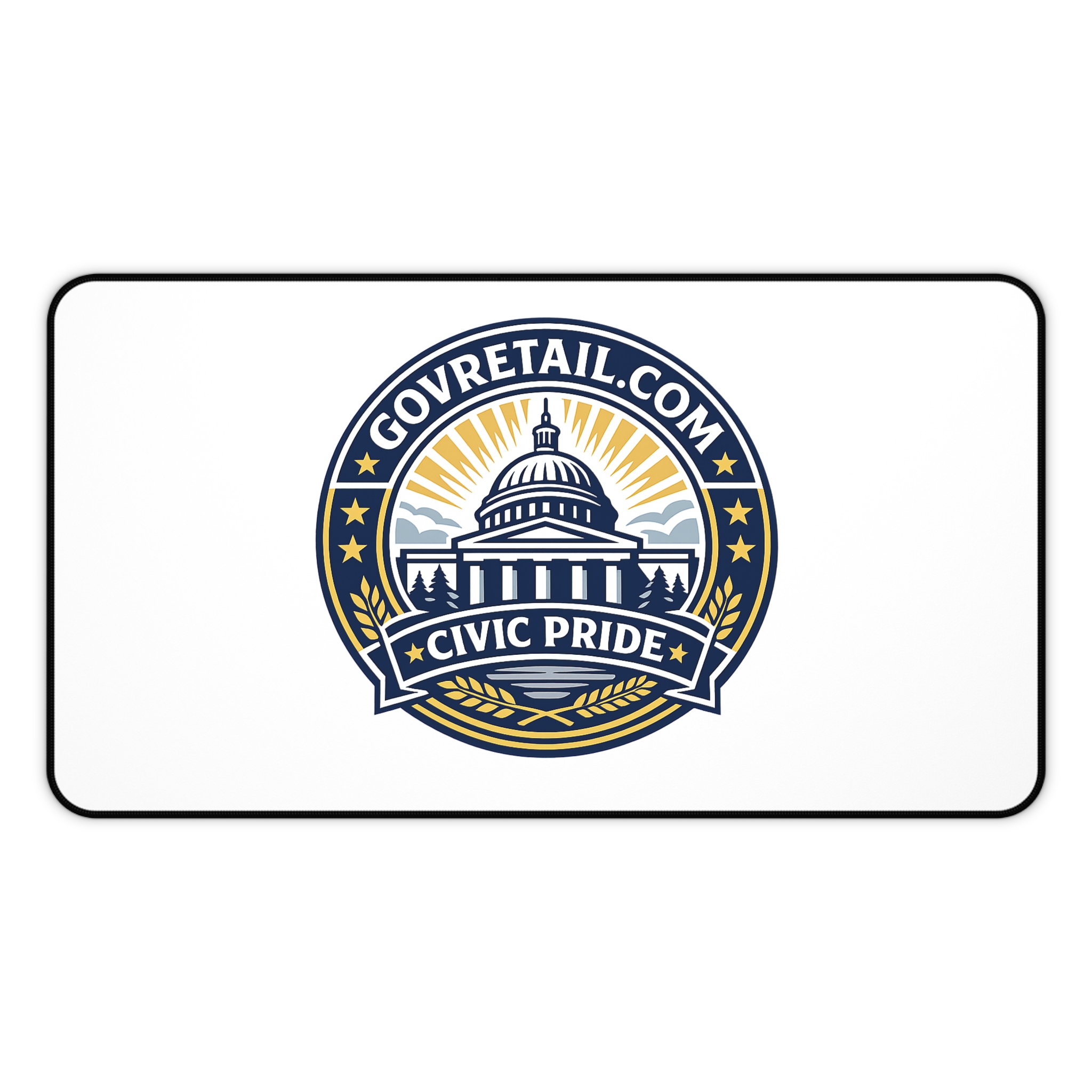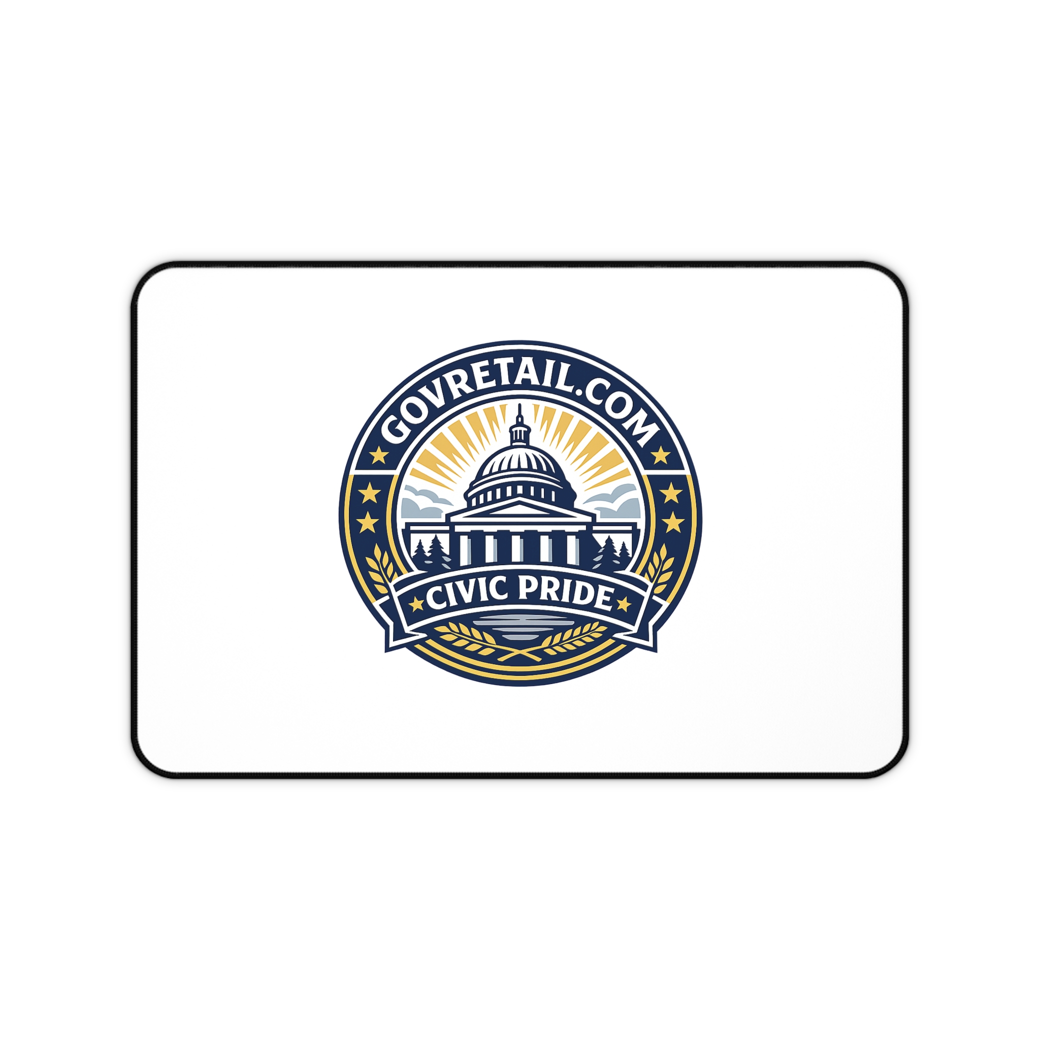 A refined neoprene desk mat that brings civic pride to your workspace. The clean white surface showcases a bold emblem-style design of a capitol dome, stars and banners in navy and gold — crisp, bright printing that stands out without overwhelming your desk. Hemmed edges and a thick neoprene core give it a sturdy, durable feel under your hands. The textured, anti-slip backing keeps the mat firmly in place while you type, write, or craft. Available in three sizes to suit a compact home office or a full desktop setup, this mat doubles as a smooth mouse surface and protective layer for daily work rituals.